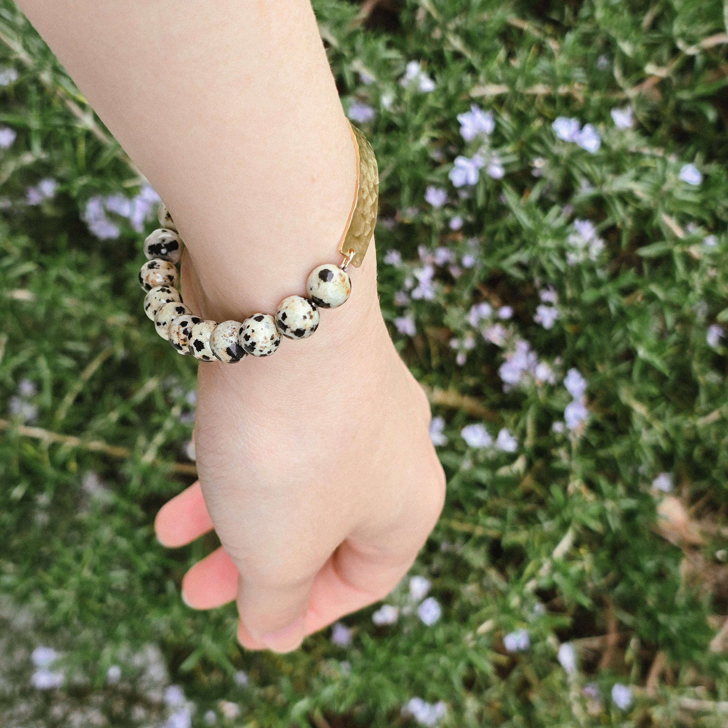 真鍮と天然石を贅沢に組み合わせたこのバングルは、ダルメシアンジャスパーを使用しており、個性豊かなデザインが最大の魅力です。どんなシーンにもマッチし、普段使いから特別な日まで大活躍します◎